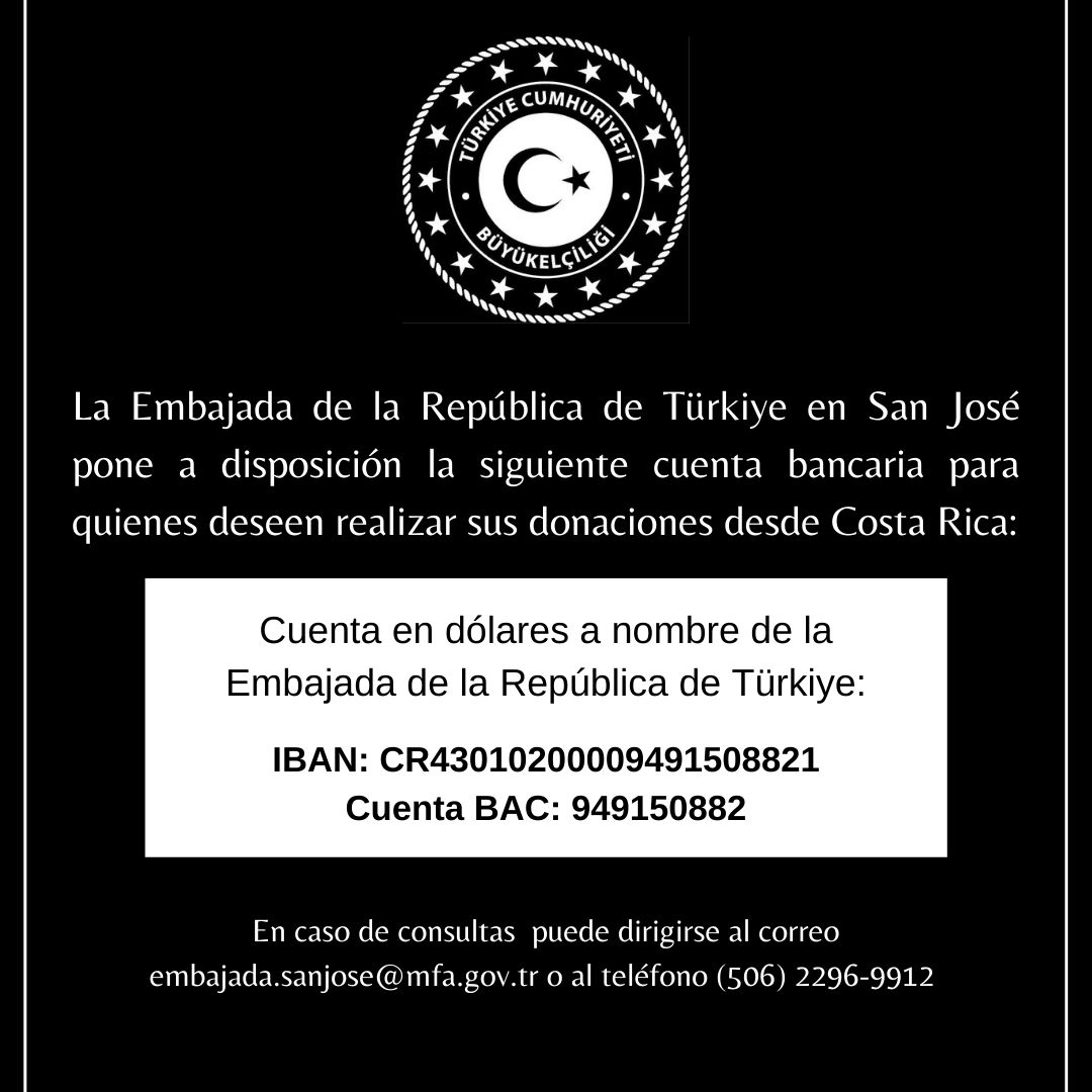Número De Cuenta Abierta Para Brindar Apoyo Desde Costa Rica A Los Ciudadaños Turcos Afectados Por Terremoto